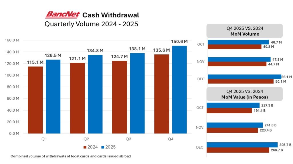 Through its wide network of ATMs and interconnections with international card networks: JCB, KFTC, MasterCard, Union Pay, VISA, and AMEX, BancNet enables both local and international cardholders of its members to access their accounts all over the country.